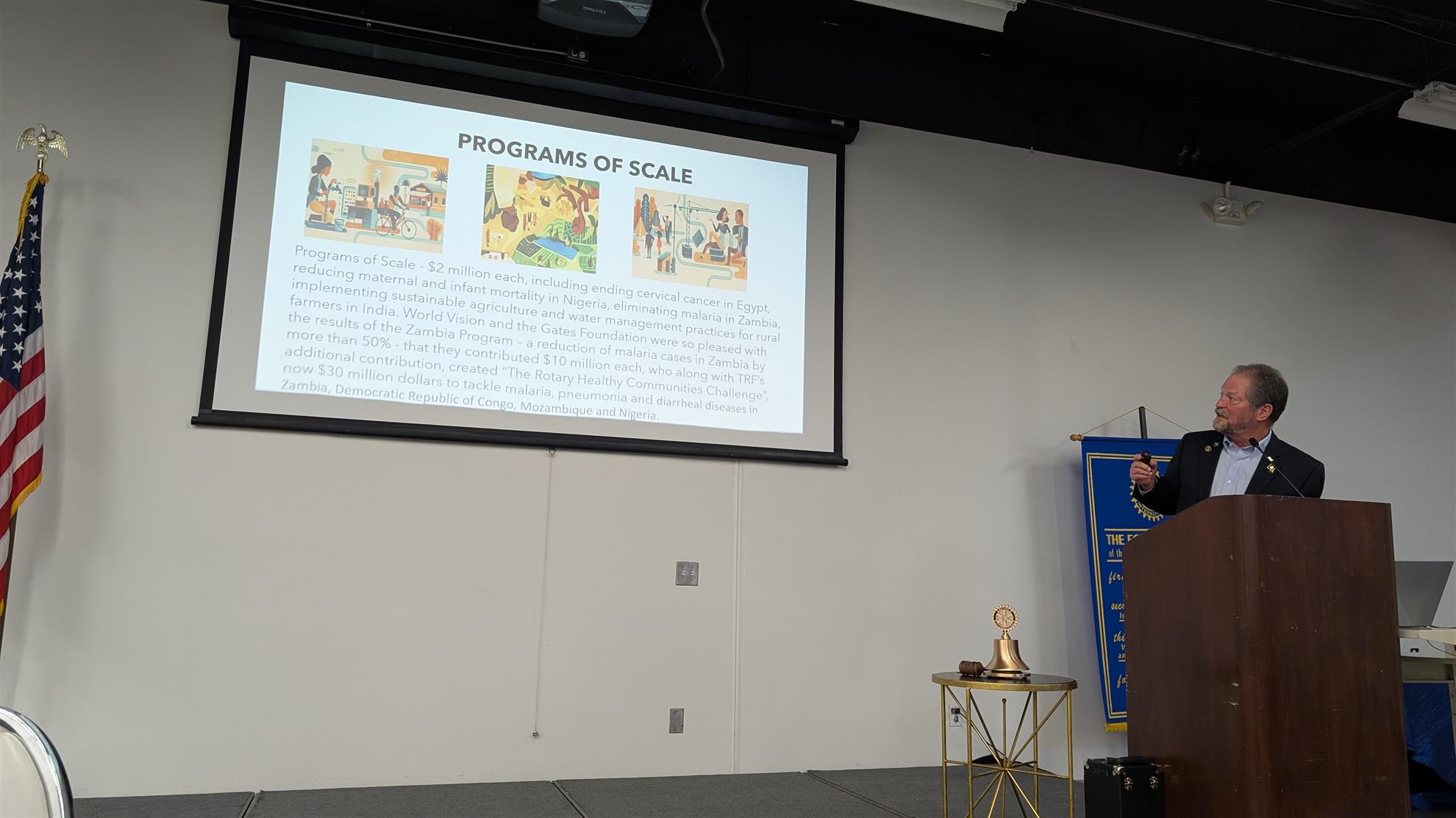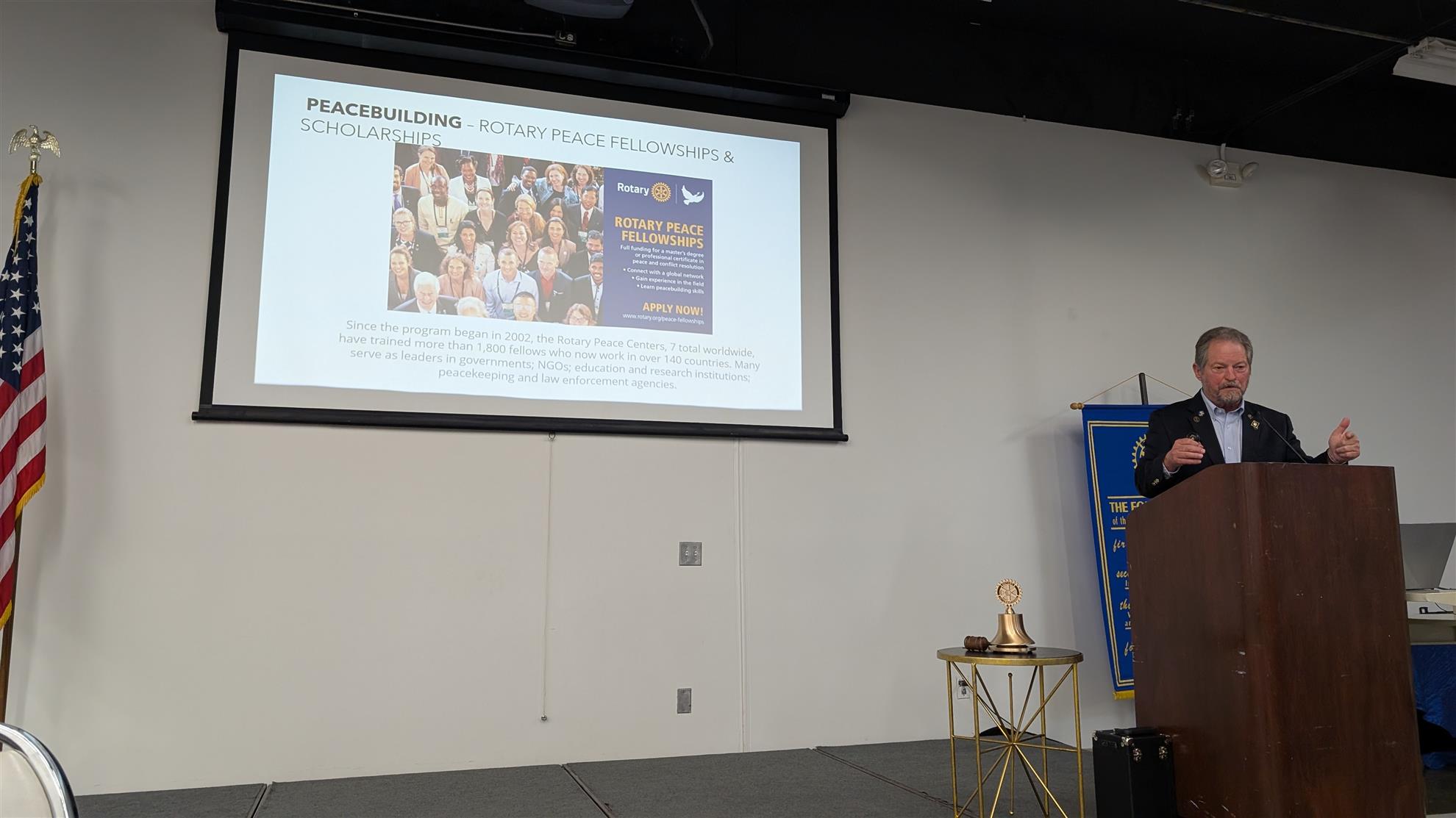 Bruce talked to about the Annual Fund and the various programs Rotary Clubs can implement, including Programs of Scale where $2,000,000 to each program is allocated for solving large problems like ending cervical cancer in Egypt and reducing maternal and infant mortality in Nigeria. He also mentioned Peacebuilding, with Rotary Peace Fellowships and Scholarships that afford a master's degree or professional certification in peace and conflict resolution.